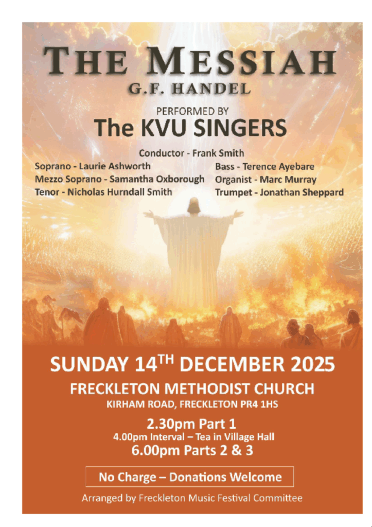 Freckleton Music Festival Committee are continuing the proud tradition of over 100 years, offering a performance of “Handel’s Messiah”. This is on Sunday 14th December at Freckleton Methodist Church, Kirkham Road. Starting at 2.30pm for Part 1. There is a break at approximately 4.00pm for Afternoon tea in the Memorial Village Hall. Carol singing back in church at 5.15pm followed by Parts 2 &3 of Messiah at 6.00pm.